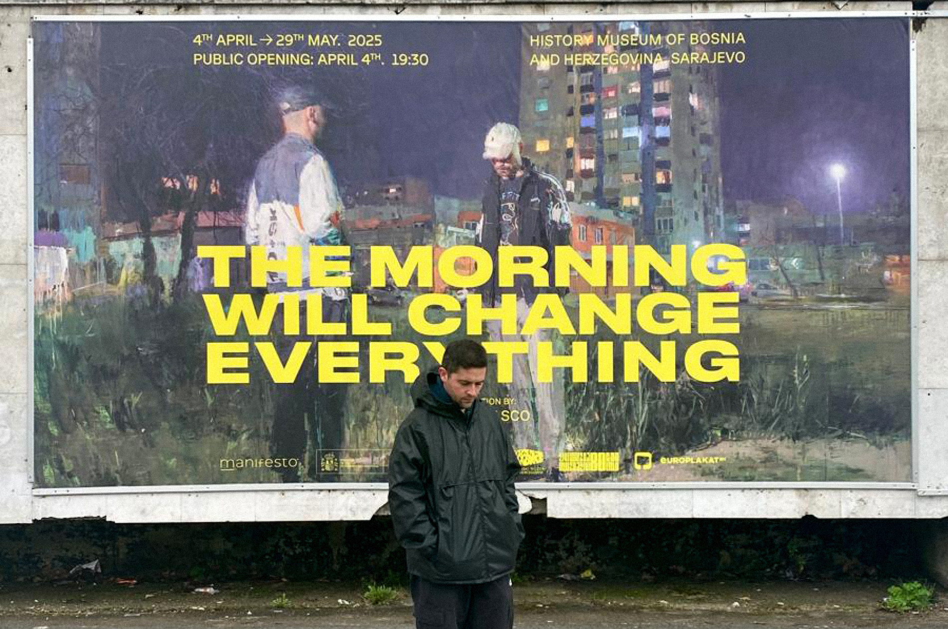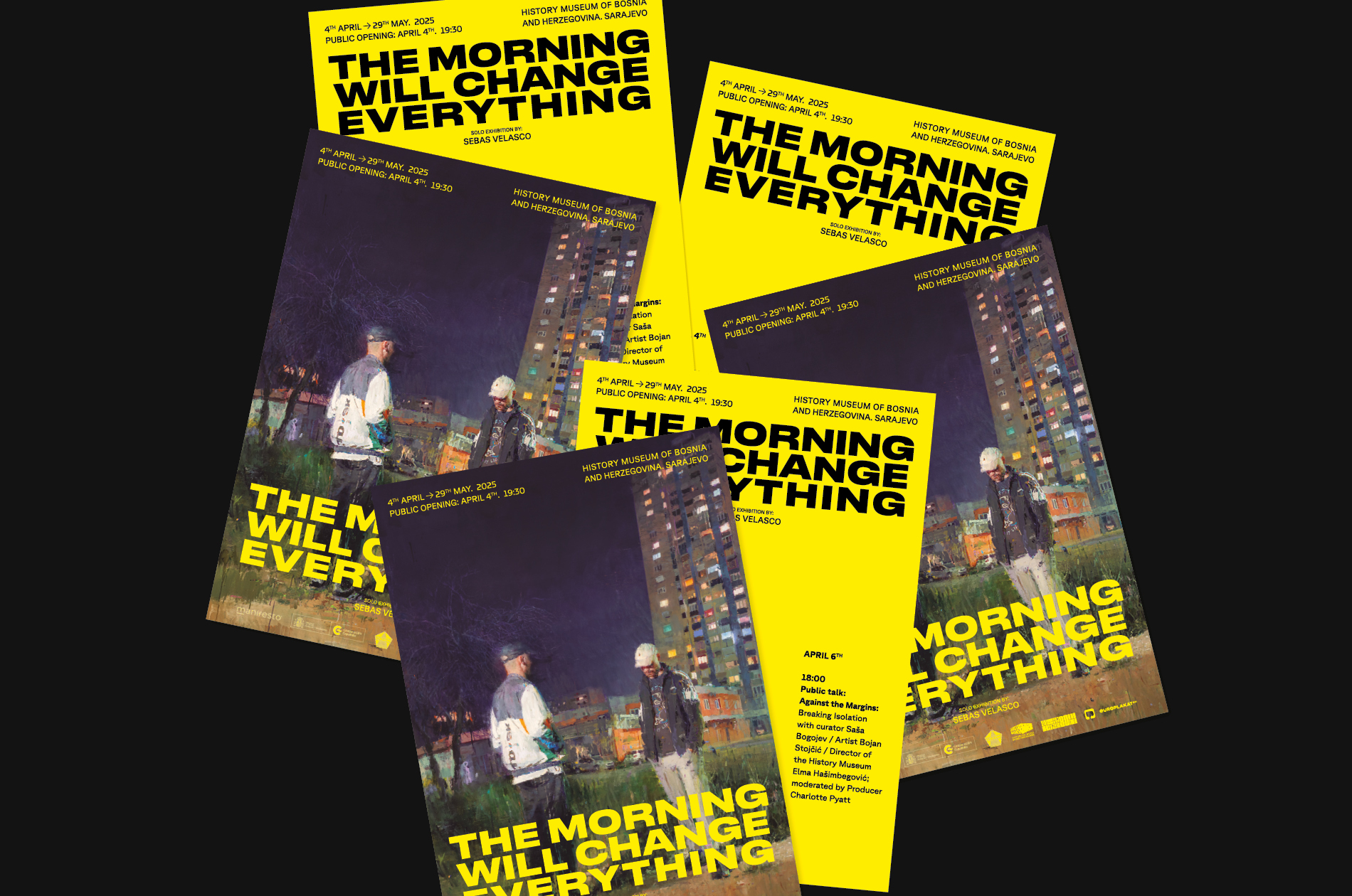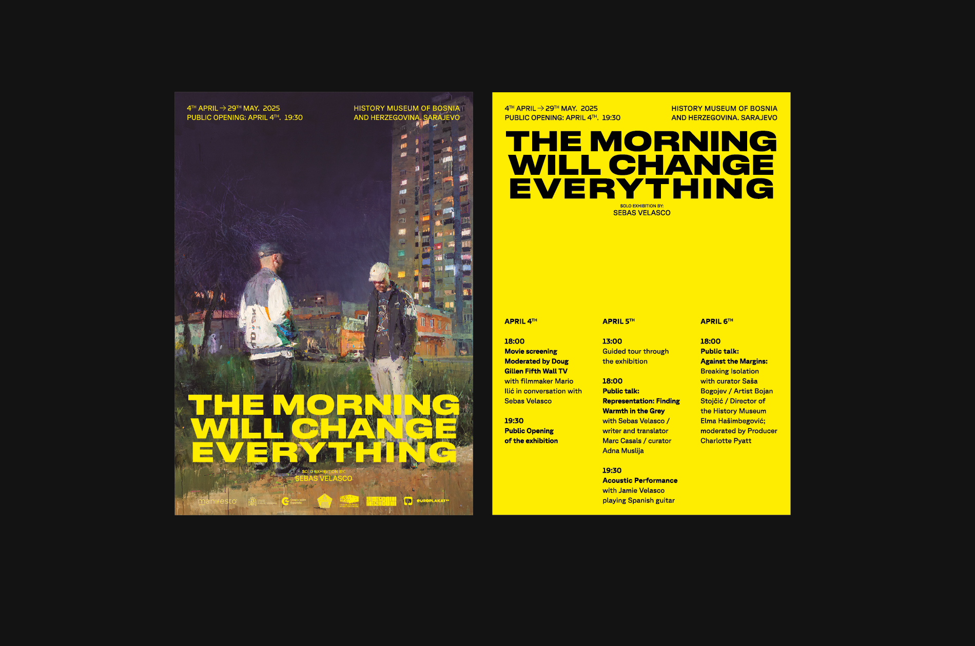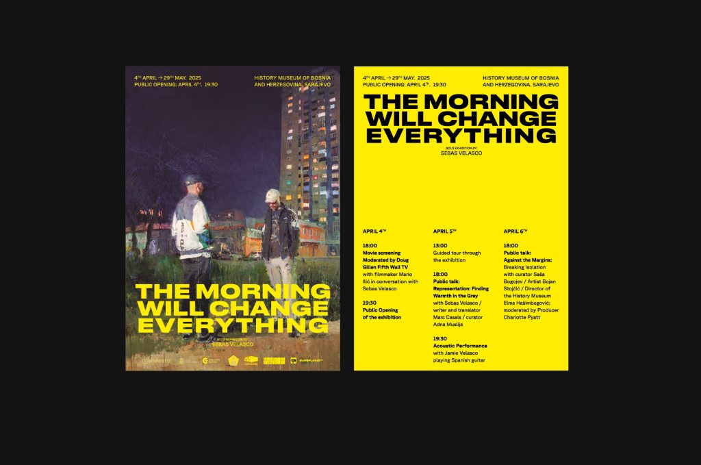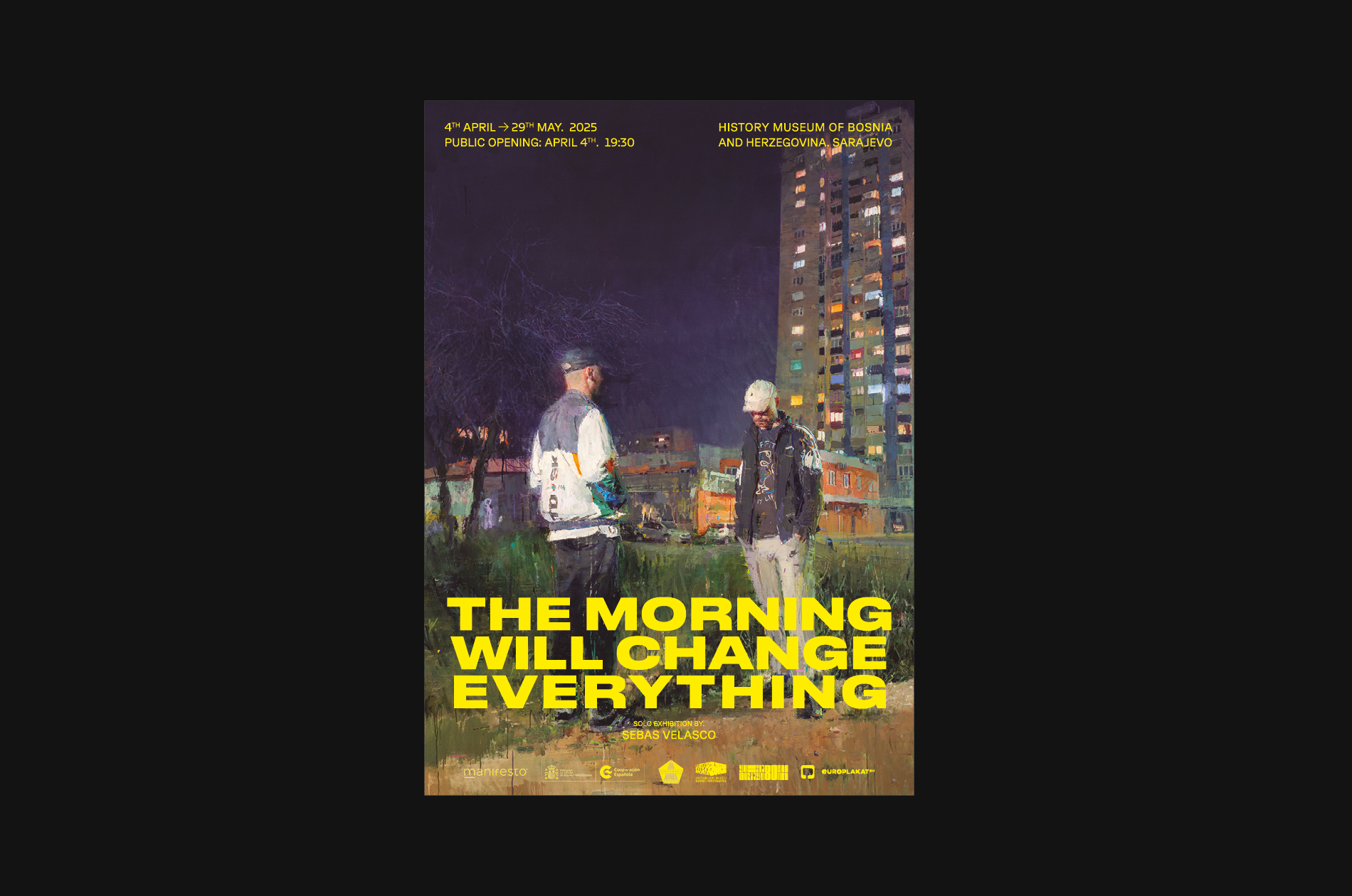 Desarrollo integral del diseño gráfico para la exposición “The Morning Will Change Everything” del artista Sebas Velasco, presentada en el Museo de Historia de Bosnia y Herzegovina, en Sarajevo (The History Museum of Bosnia and Herzegovina) El proyecto incluyó el diseño del cartel oficial, las piezas de comunicación y los paneles expositivos, concebidos para acompañar el discurso curatorial y reforzar la experiencia visual y narrativa de la muestra.